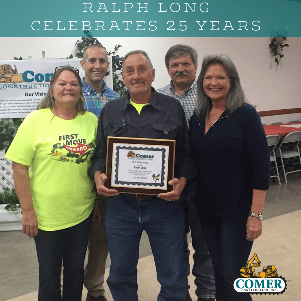 Two decades and five years ago, Ralph Long started his first day with Comer Construction. Here we are 25 years later, and we are so happy that Ralph continues to be part of our Comer Construction Family. Today, Ralph works hard daily as an Equipment Operator on our utility crew. Thank you Ralph for your 25 years of service and loyalty to Comer Construction. We can’t wait to celebrate 25 more with you! 🙂